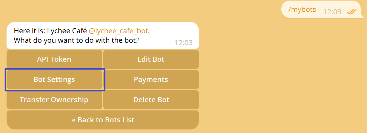 "/mybots" 명령어를 사용해 에이전트 관리 인터페이스로 들어가세요.