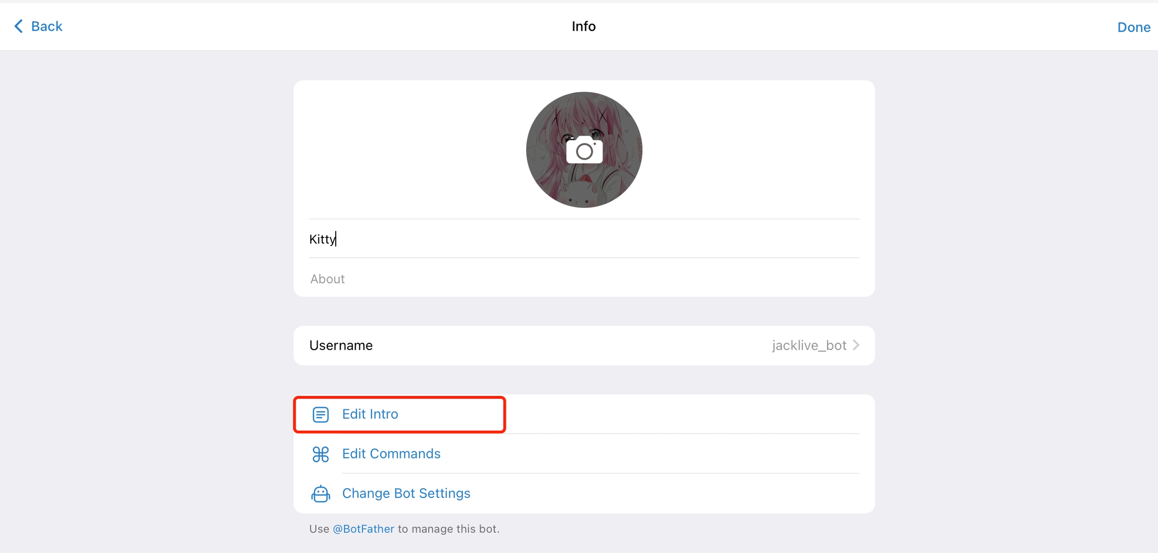 Telegram을 통해 에이전트 세부 페이지에서 "Edit"를 클릭한 뒤 "Edit Intro"를 선택하세요.