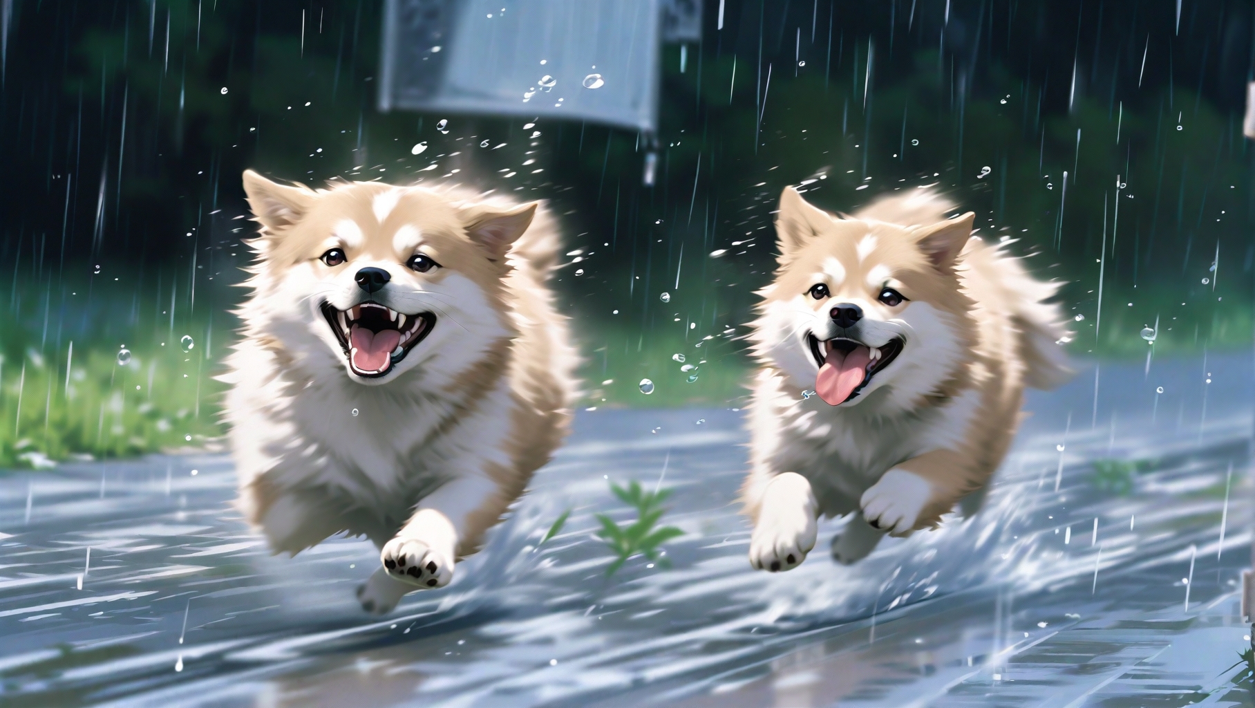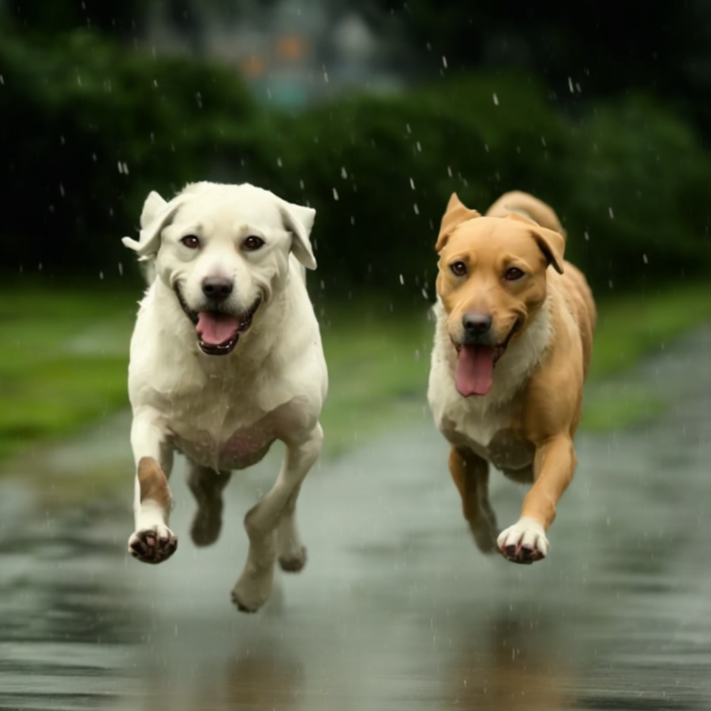*(prompt: two dogs running in the rain.)