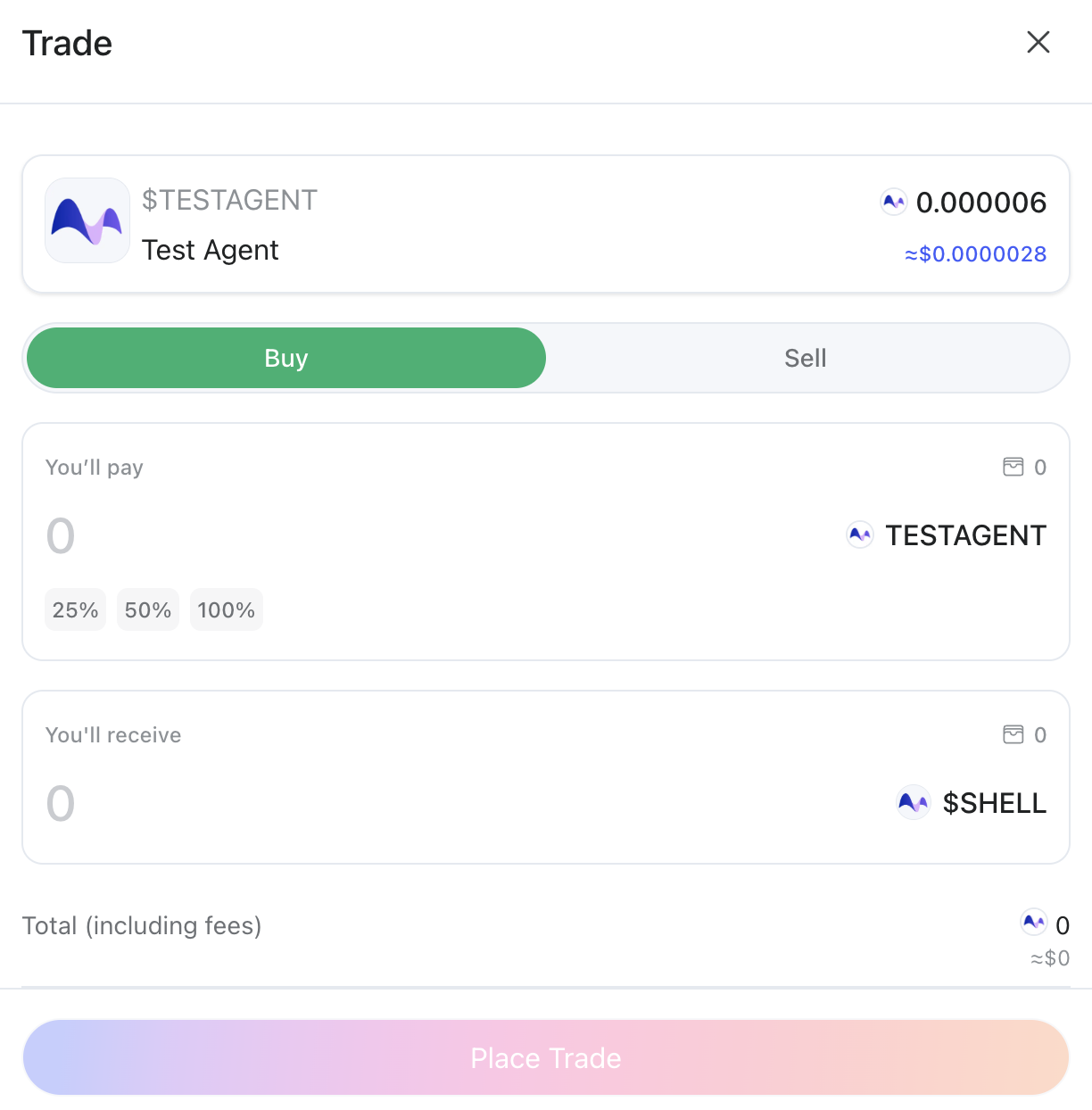 You can also buy or sell a certain amount of the agent token via $SHELL or $BNB by clicking the Trade button.